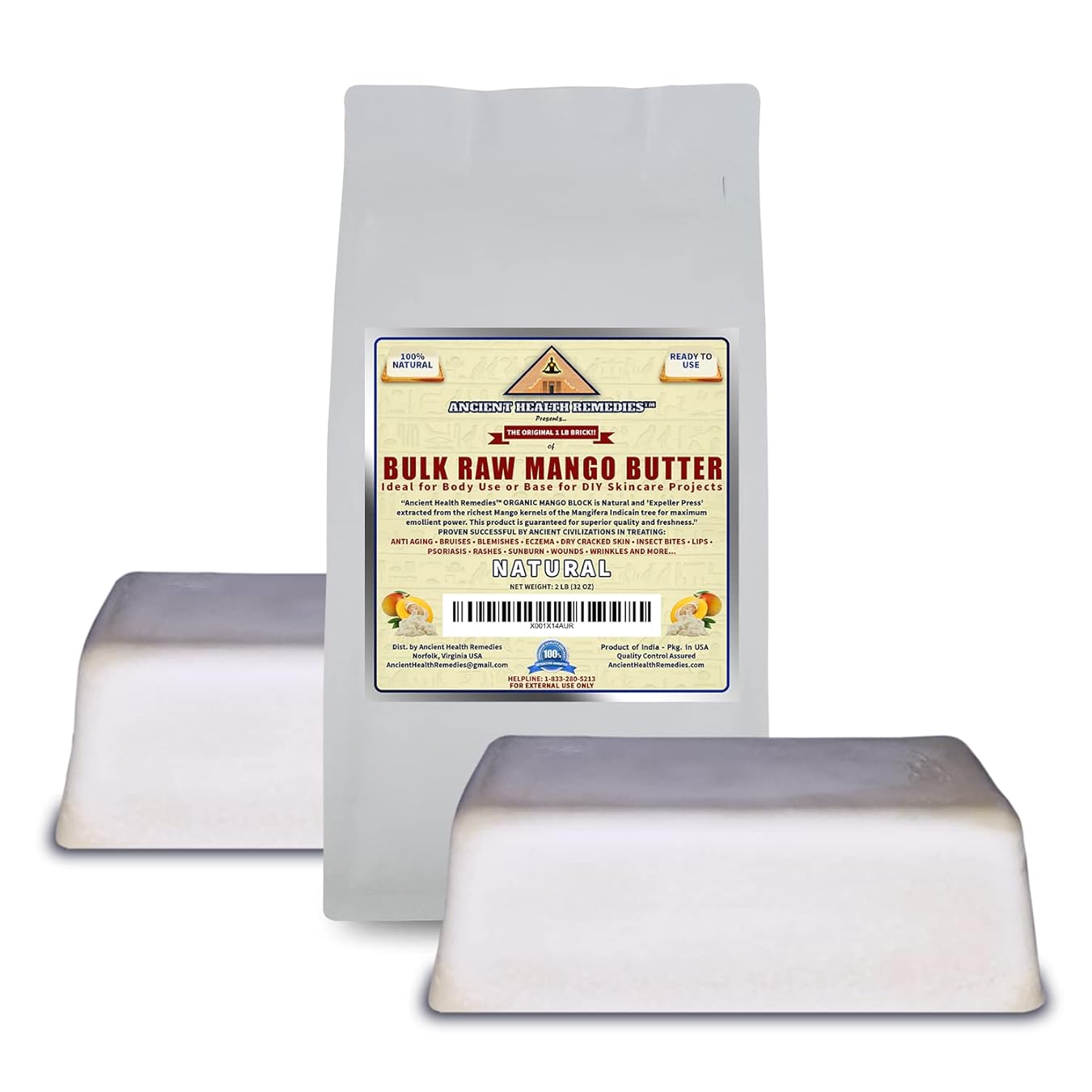 ANCIENT HEALTH REMEDIES Organic Unrefined Raw MANGO BUTTER JAR/BLOCKS Bulk, Light Mango Aroma, Non-Greasy Base for Beauty, Skin Moisturizing, DIY Base for Body Butter & Hand Creams (2 LB)