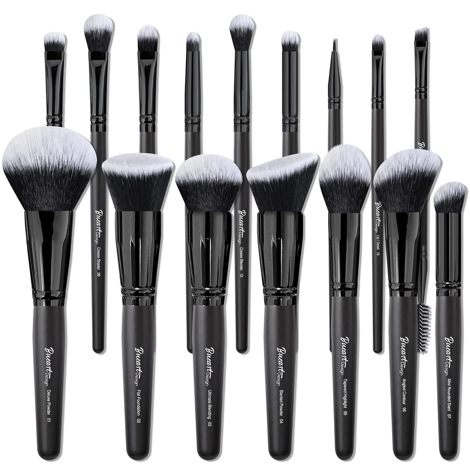 Bueart Design 16Pcs ULTRA SOFT Black labeled DENSE HAIR Makeup Brushes set Contains large powder Flat Foundation Ultimate Blending Make up Brush set Blush Face Brush Concealers contour Eyeshadow
