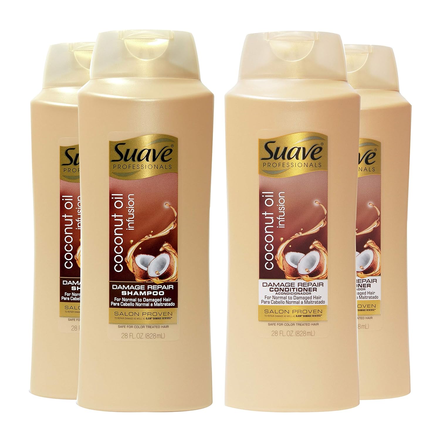 Suave Professionals Damage Repair Shampoo + Conditioner Coconut Oil, 28 Fl Oz (Pack of 4)